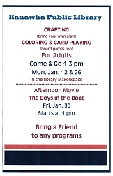 Do you have a favorite hobby, activity, talent, or special information that you would like to share with the community? The Kanawha Public Library would love to host a gathering for you to share your interest. Stop in or contact us on facebook or Homebound Library Service We are pleased to announce that we are offering a homebound delivery service within the city limits of Kanawha including residents of the care center. Please call the library if you or someone you know would like us to bring the library to them: 641-762-3595.