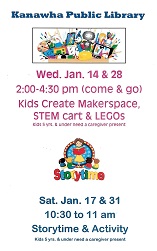 Kids Create MakerSpace, STEM & LEGOs: Kids use free library supplies to imagine and make crafty creations to take home and/or explore the various STEM and LEGO activities available. Come & Go. Kids 5 yrs. old and under need a caregiver present. Calendar