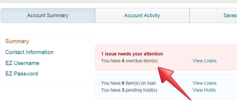 Under the Account Activity tab, you can quickly review your current list of items checked out along with any fines on overdue items.