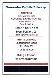 Do you have a favorite hobby, activity, talent, or special information that you would like to share with the community? The Kanawha Public Library would love to host a gathering for you to share your interest. Stop in or contact us on facebook or Homebound Library Service We are pleased to announce that we are offering a homebound delivery service within the city limits of Kanawha including residents of the care center. Please call the library if you or someone you know would like us to bring the library to them: 641-762-3595.