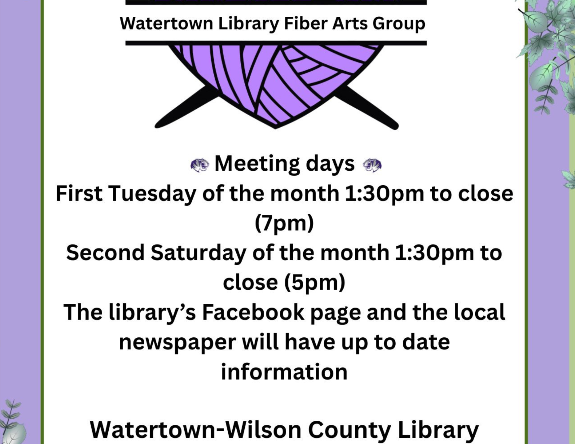 Our Fiber Arts Group will meet on the first Tuesday of the month from 1:30pm to 7pm, and the second Saturday of the month from 1:30pm to 5pm. All ages and skill levels are welcomed!