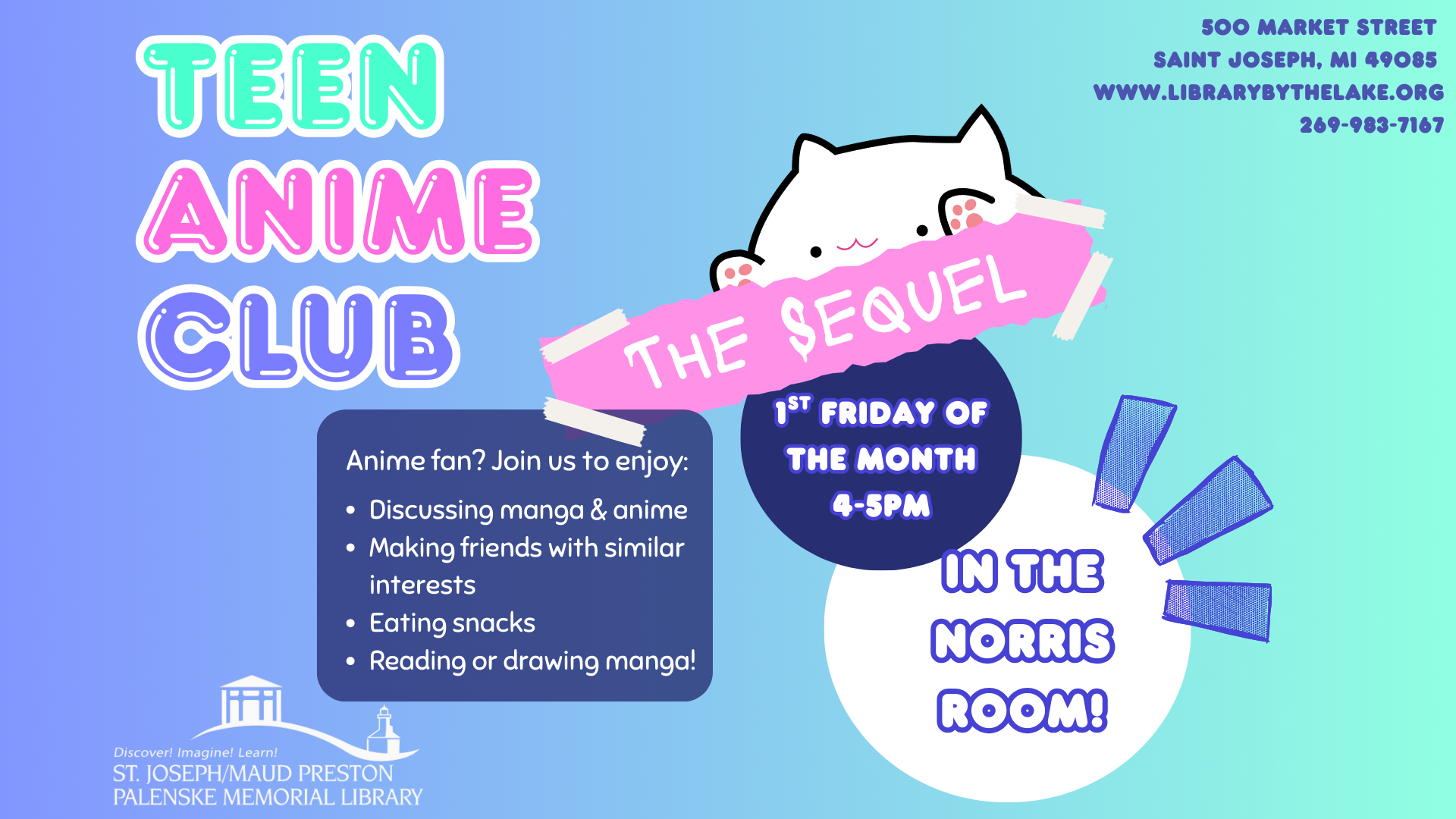Anime Club is HERE! The first Fridays of each month at 4pm in the Norris Rm.