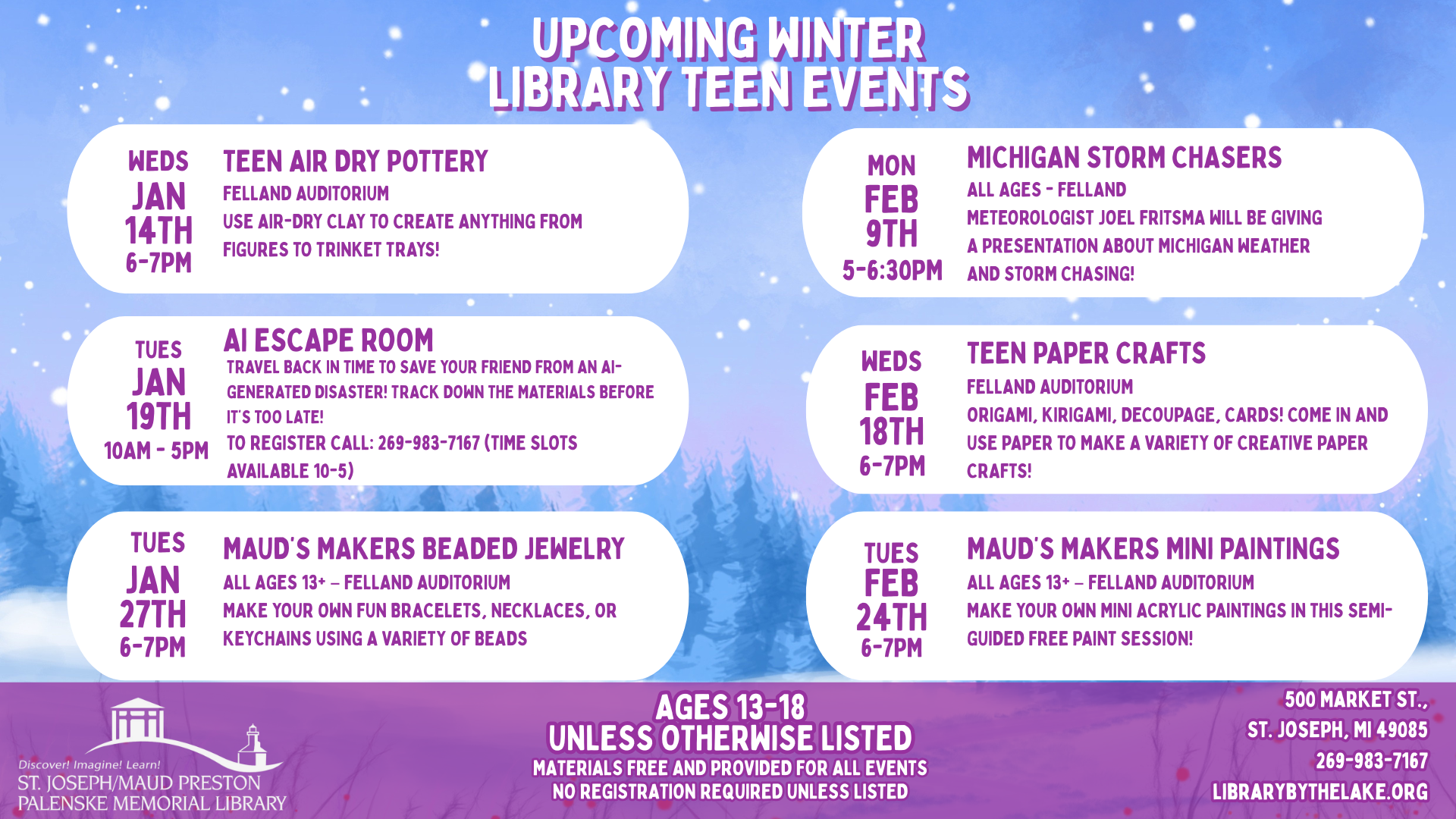 Located just inside the front door to the library is our Teen Room. This room houses materials appropriate for 7th-12th graders.The teen collection includes books and graphic novels, fiction and non-fiction. New titles are added to the collection all the time - stop in and find a new favorite!